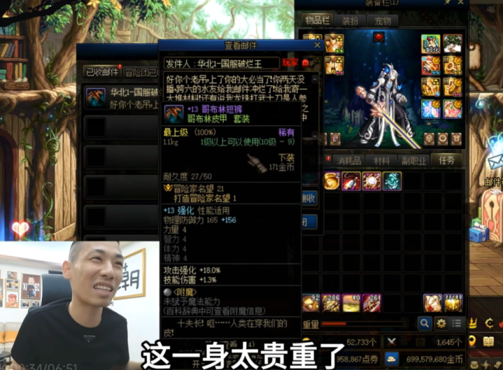 这五件紫装虽然只是10级的紫装,但这可是地下城唯一可以无限交易的紫装哥布林套装啊,而且这还是强化13的哥布林套,这价值可就更加高了。而这把蓝色的武器执行巨剑更是强化16的存在,这一身装备实在是太贵重了宝哥都不敢收下,随后立马也是赶紧退回邮寄回去了。