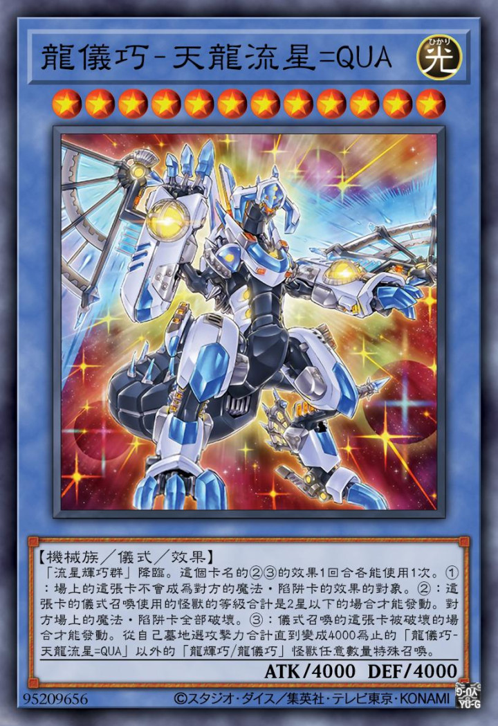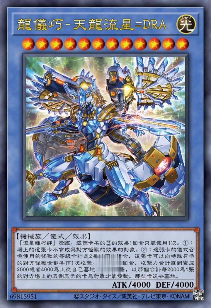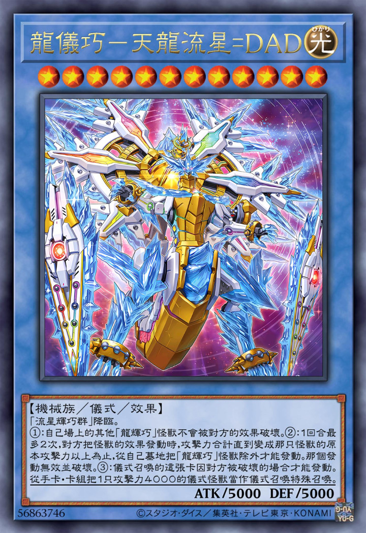 流星辉巧群,是该系列仪式怪兽共用的仪式召唤卡,而对应着DAD的这只龙仪巧字段怪兽,具有5000点的攻击力跟防御力,是目前已知单卡上限5000点固定攻击力数值巅峰的代表之一。而其效果方面也是非常好的,除了主动发动的效果之外,在这只怪兽被对方破坏的场合,还能直接从手卡或者卡组召唤攻击力4000点的仪式怪兽特殊召唤,即针对下面的两只同字段顶尖仪式怪兽设置的效果。