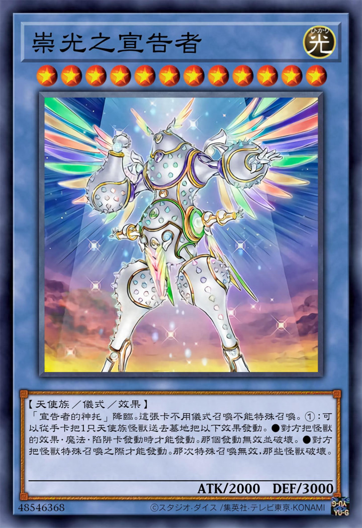 这里也能看出,12星的高等怪兽,都不是什么省油的灯。其对应的仪式召唤卡是宣告者的神托,而发动效果的话,则需要将手卡的一张天使族怪兽送去墓地才能触发,没有的话就不能触发了。
