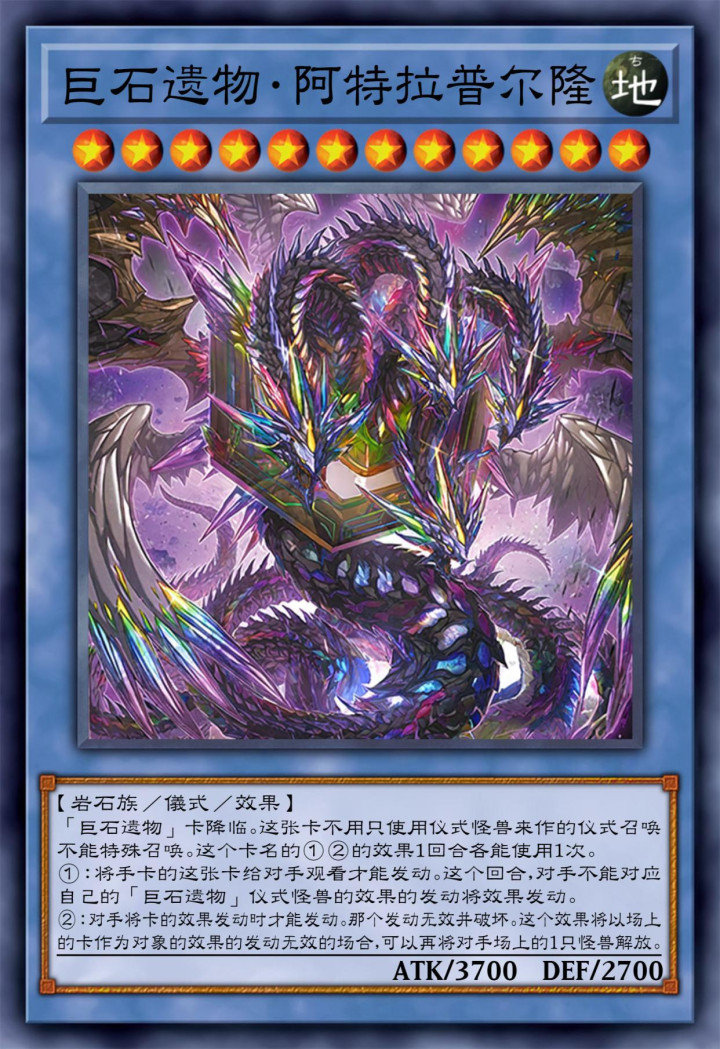 巨石遗物字段的怪兽,也有翻译为“遗迹巨石”的版本,这只怪兽需要巨石遗物卡片的效果才能降临,而其召唤出来之后两个效果一回合各能使用一次。首先是不能针对此字段的仪式怪兽的效果的发动将效果发动,即无法针对此类怪兽的能力将其无效化。而第二个效果,则是主动发动的,让对方效果发动无效并进行破坏,甚至能够解放对方场上的一只怪兽。