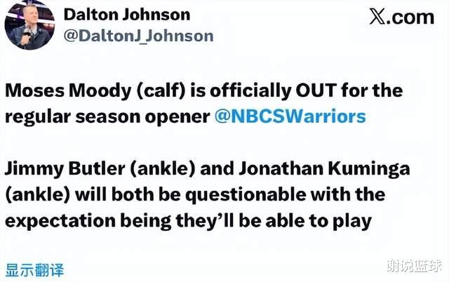 根据记者道尔顿-约翰逊报道,勇士揭幕战前就遭遇打击,其中23岁后卫摩西-穆迪会确定休息,无缘揭幕战比赛。此外两名锋线大将吉米-巴特勒和乔纳森-库明加,同样也是有伤在身,目前处于出战成疑状态。