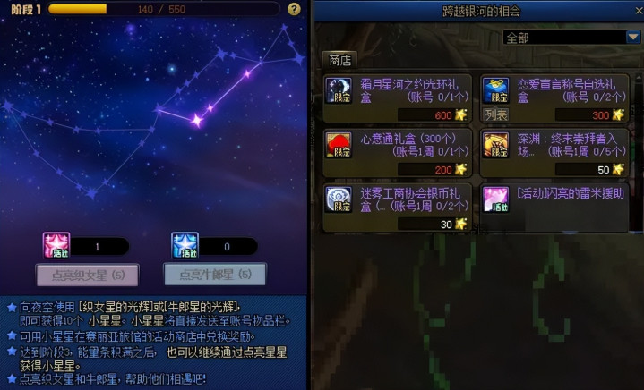 七夕专属活动,在活动期间内,每日在线5分钟可获得10个“牛郎星”,刷图可获得“织女星”。