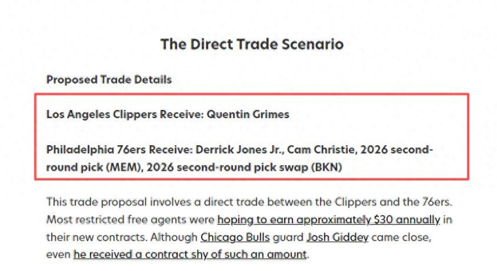 所以媒体认为快船,应该寻求零换整的交易,这样会让阵容更加强大。比如快船可以追求后卫昆汀-格莱姆斯,上赛季他转投76人,打出职业生涯最佳表现。而前扣篮王德里克-琼斯加上去年次轮秀卡姆-克里斯蒂,会成为交易主要筹码,至于次轮签和选秀互换权,都已经算微不足道的添头。