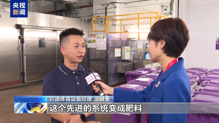 总台记者马媛:启德体育园主要场馆可容纳的观众总人数超过6.5万人,我们可以想象在大型赛事期间每天会产生多少垃圾。所以园区设置了废物分类和回收系统,利用微生物技术来处理,将厨余垃圾以及纸杯、饭盒等纸制容器转化为堆肥,用于植物施肥,来实现废物利用及园景保养。